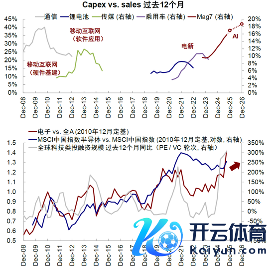 AI科技投资风起云涌。一方面,中好意思科技投资陆续增长,2026年“好意思股七姐妹”仍在2025年本钱开支同比增长65%的基础上看护了10~20%的双位数增长,中国科技“十巨头”的2025年本钱开支预期增速也在年头转正后持续升至9月的26%。固然AI泡沫化的接洽仍在延续,但“此次不一样”:1)需求救援本钱开支的持续推广,“好意思股七姐妹”本钱开支与营收的比例自2023年四季度的9%抬升至15.9%,2026年市集意想将进一步上行至19%,投资热度仍看护高位;2)里面融资智商虽小幅回落,但尚未泡沫化,“好意思股七姐妹”本钱开支与筹划性现款流的比例自2023年底的33%升至2025年三季度的49%,仍低于互联网泡沫时候的高点56%;本钱开支与净利润的比例走高至63%,但显贵低于互联网泡沫翻脸前的高点99%;3)股权融资主导,显贵裁减杠杆风险。科技龙头股债务与权力比自2023年的48%持续回落至2025年三季度的32%,显贵裁减了高利率环境下的系统性杠杆风险。