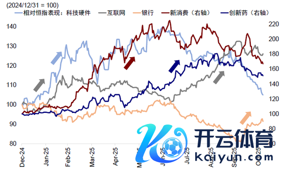 ► 轮动显贵:结构行情固然亮眼,但关于投资者操作上却是熟习,抓准结构可获远超指数的收益,违犯若判断不实则可能大幅跑输基准。板块轮动的配景下,A港好意思三地市集更是出现以季度维度明晰的切换端倪,其中既有此消彼长的“跷跷板”效应,也有映射的联动。一季度DeepSeek引颈中国资产重估,恒生科技领跑;二季度平等关税后好意思股科技龙头事迹与本钱开支超预期发扬最初,港股新蹧跶更动药起步,但恒生科技永远没回到3月高点;三季度国内住户进款活化以及“中好意思映射”下的科创算力行情A 股自后者居上;而9月以来“宽松来回”与互联网龙头AI叙事升温下港股再度跑赢。