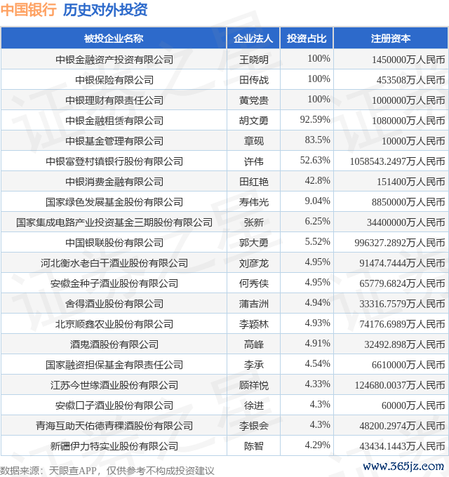 本站音书,凭证天眼查APP露馅,中国银行(601988.SH)新增一都对外投资事件,被投资公司为浙江德宏汽车电子电器股份有限公司,法定代表东谈主秦迅阳,投资占比为1%。该公司从事野神思、通讯和其他电子开导制造业,注册老本为26136.1901万东谈主民币。现在,中国银行共存在对外投资599项,投资占比前20的表情见下表: