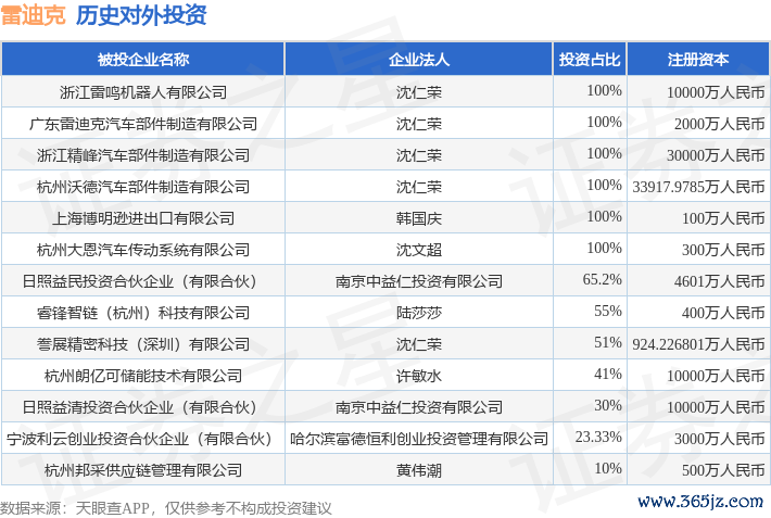 本站音问,凭据天眼查APP清晰,雷迪克(300652.SZ)新增一王人对外投资事件,被投资公司为誊展精密科技(深圳)有限公司,法定代表东谈主沈仁荣现金九游体育app平台,投资占比为51%。该公司从事金属成品业,注册成本为924.226801万东谈主民币。现在,雷迪克共存在对外投资13项,详见下表: